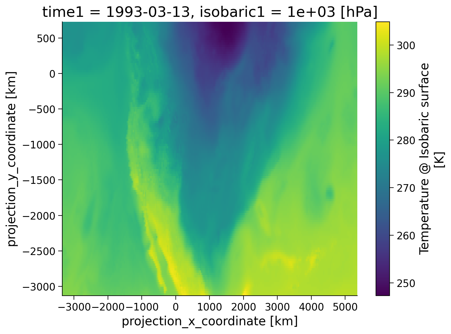 geospatial_lon_max: -42.666108129242815We can further subset to a single DataArray to isolate a specific climate measurement. Let’s subset temperature from the atmospheric level at which the isobaric pressure is 1000 hPa: