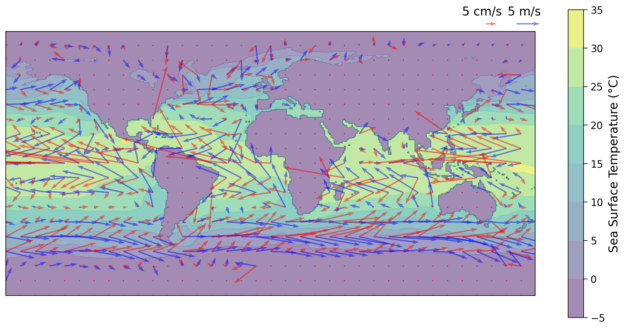 * longitude (longitude) float64 6kB -179.8 -179.2 -178.8 ... 179.2 179.8Let’s add ocean surface currents to the previous plot above, using red quivers. Note the scale of the arrows for the ocean and atmosphere are very different.