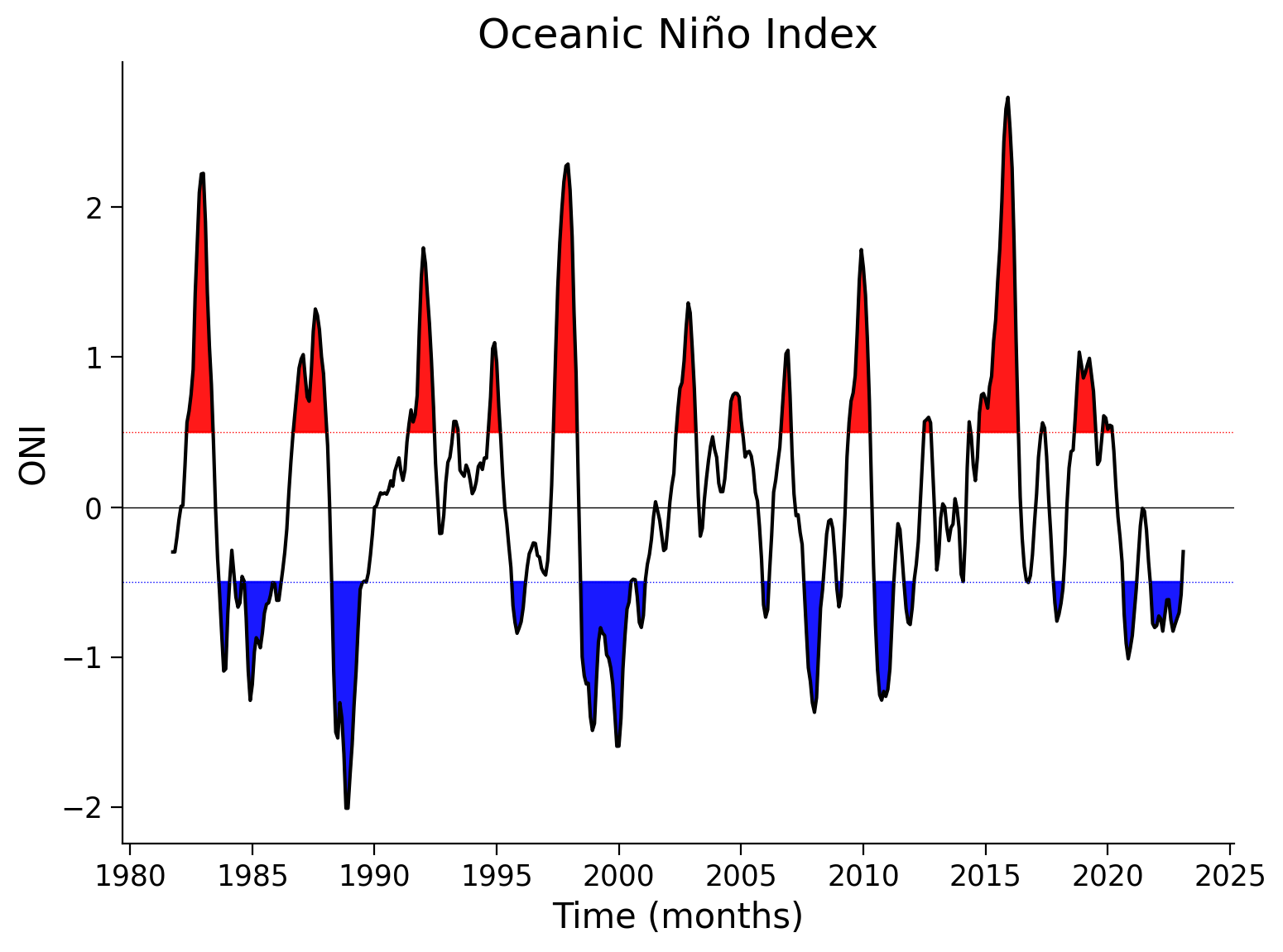 The different phases of ENSO are nominally defined based on a threshold of \(\pm\) 0.5 with the ONI index.