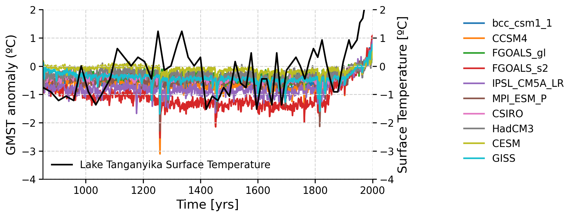 You’ll also compare the PMIP3 GMST data to a proxy-based reconstruction of temperature from Lake Tanganyika in East Africa (Tierney et al., 2010). Through this proxy-model comparison, you’ll be able to assess the differences and similarities between the two datasets.